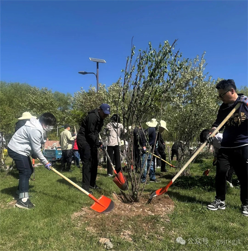 活动当日晴空万里,在公园专业技术人员指导下,集团领导率先垂范,与干部职工“并肩奋战”,大家分工明确、协作有序,共同栽种海棠、榆叶梅、碧桃等观赏树木和牡丹、月季、绣球等花卉,为黄河之畔再添新绿。泥土芬芳中,铁锹与笑语和鸣成曲,青年团员们自发组成“搬运苗木小分队”穿梭奔忙保障供给;部分女职工组成“杀菌沃土先锋组”,精准投放药剂为土壤消毒;由青年党员组成的“乔木攻坚团” 更是勇挑重担,主动承担种植冠幅大、重量重的海棠、碧桃等乔木的任务,喊着口号扶正碗口粗的树干,覆土时反复校准树干垂直度,各小组默契配合,现场一片热火朝天。随着“种植先锋队”完成最后一株月季栽种,历时三小时的连续奋战,295株新苗在公园内指定规划区域内安家落户,形成“春观海棠、夏赏绣球、丁香独秀、月季连廊”丰富的景观带。