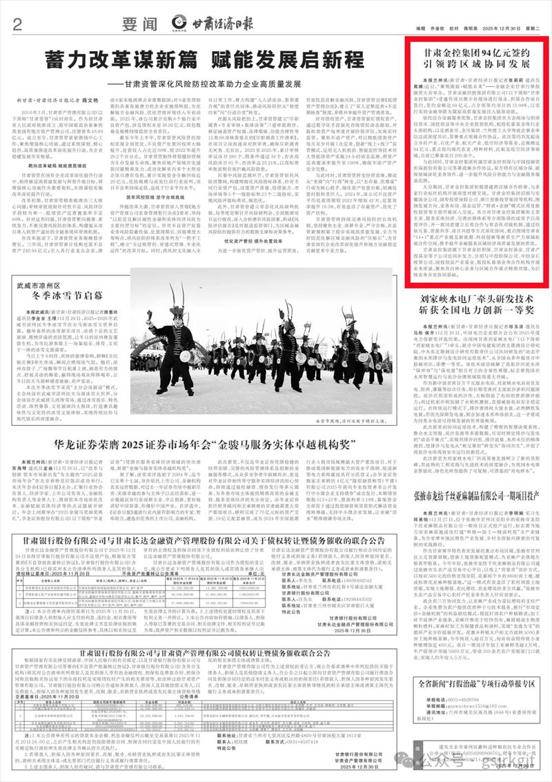 所属甘肃金控担保与中国投融资担保股份有限公司签署战略合作协议,双方将在区域分保、联保领域深化业务协作,进一步提升风险分担能力与金融服务覆盖范围。